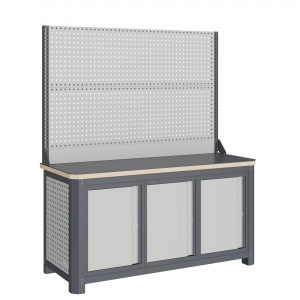 Экран (перфорированная панель) верстака выполнен с квадратной перфорацией 12х12 мм с шагом 38 мм для установки крючков, держателей и других аксессуаров. Экран крепятся к столешнице с помощью специальных кронштейнов. Максимальная масса груза, равномерно распределенного по поверхности экрана, составляет 71 кг.